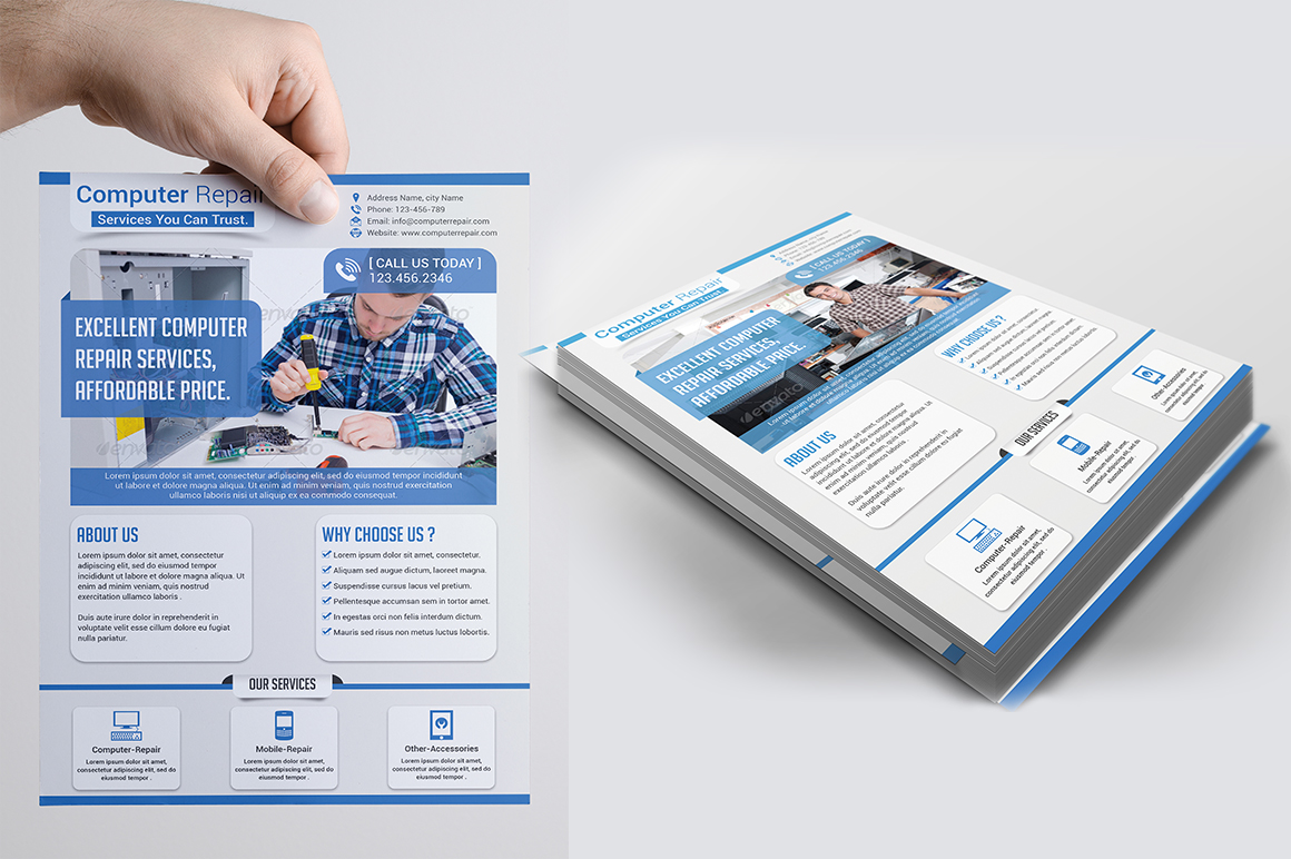Computer Repair Business Flyer ~ Flyer Templates ... from cmkt-image-prd.global.ssl.fastly.net Check out this business flyer example that tells recipients at the bottom that they can redeem a free drink The average size of a standard flyer is a computer paper (8.5''x11'') in the us or the standard a4 (8.3''x11.7''). ✓ free for commercial use ✓ high quality images. Promote your repairing business in the easiest way possible. Free computer repair flyer templates, technician. Graphic design service flyer template mycreativeshop. Choose from 119 printable design templates, like service flyer posters, flyers, mockups, invitation cards, business cards, brochure,etc. To add a product to favorites simple click on near product's image.